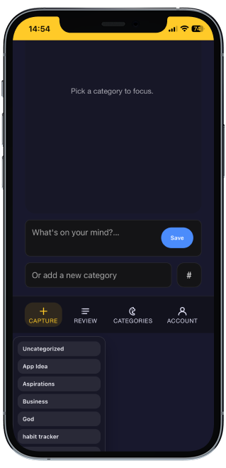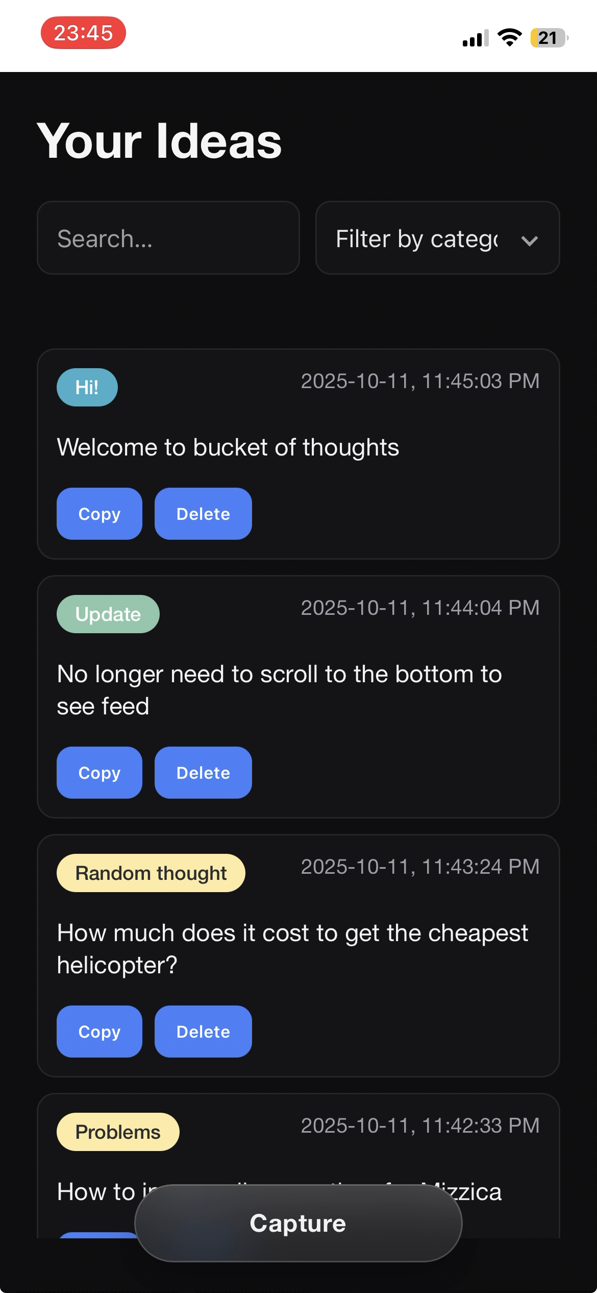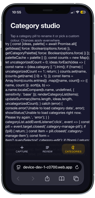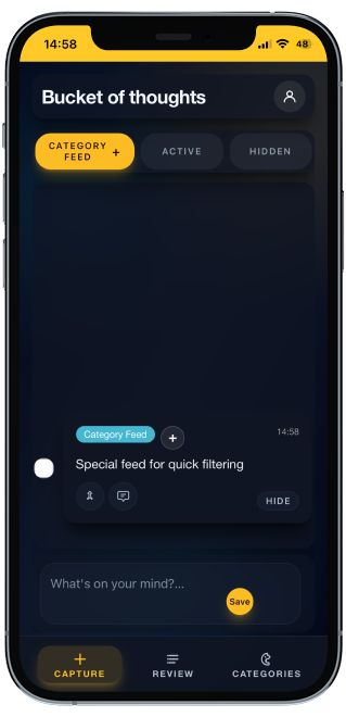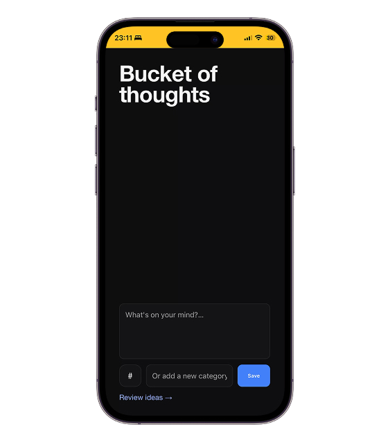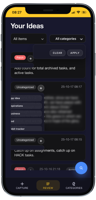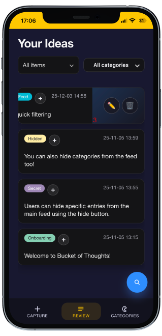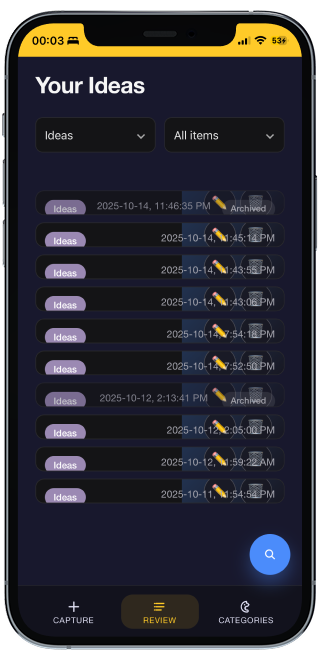 Originally, the main page only had the capture function. When an idea was saved, it would go straight to the review page. I then noticed all of the valuable space I was wasting. Naturally, I decided to fill the main page with an idea feed.