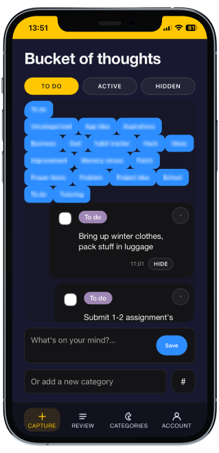 Bucket of thoughts is a personal, simple, mobile app that helps you record ideas instantly, organize them effortlessly, and return to them when you’re ready to create.
