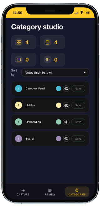 To make the app more customizable, I built the Category Studio. Sometimes I didn't like the colour of the category and wanted to change it so I created this page where you can view, rename, and recolour categories to your liking. I also added the ability to toggle visibility for each category, to give users control over what shows on the main feed.