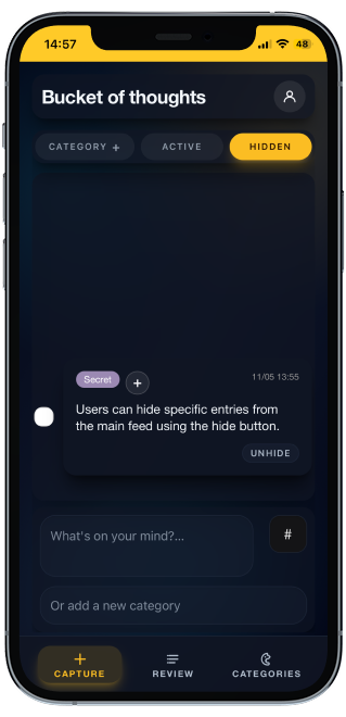 Next, I found myself needing a better way to access specific groups of ideas, instead of going to the review page and filtering each time. So I added new feeds on the main page. Category Feed - This feed allows the user to select one category to focus. This was useful to use when I just need to focus on one list. I would create a category for a project like this one, log all the ideas, and when the time comes to work on the project, I use this feed to see all of the ideas I had for the specific project. Hidden Feed - Everyone likes to have their own privacy, right? I found a need for this feature when I would take more personal or sensitive notes, and thought this would be useful to have.